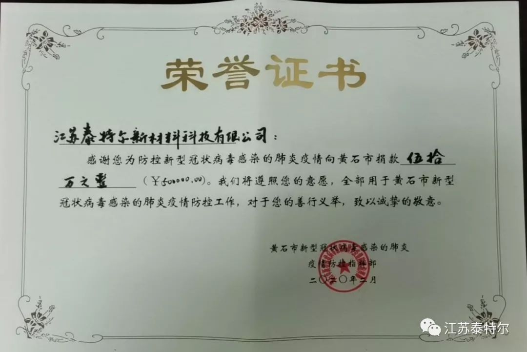 新型冠狀病毒肺炎爆發(fā),以武漢為中心迅速向周邊蔓延,目前疫情已蔓延至全國各省,面對(duì)這場(chǎng)突如其來的疫情,江蘇泰特爾新材料科技有限公司緊急決定向黃石市慈善總會(huì)捐贈(zèng)人民幣50萬元,為防控疫情貢獻(xiàn)應(yīng)有之力。
